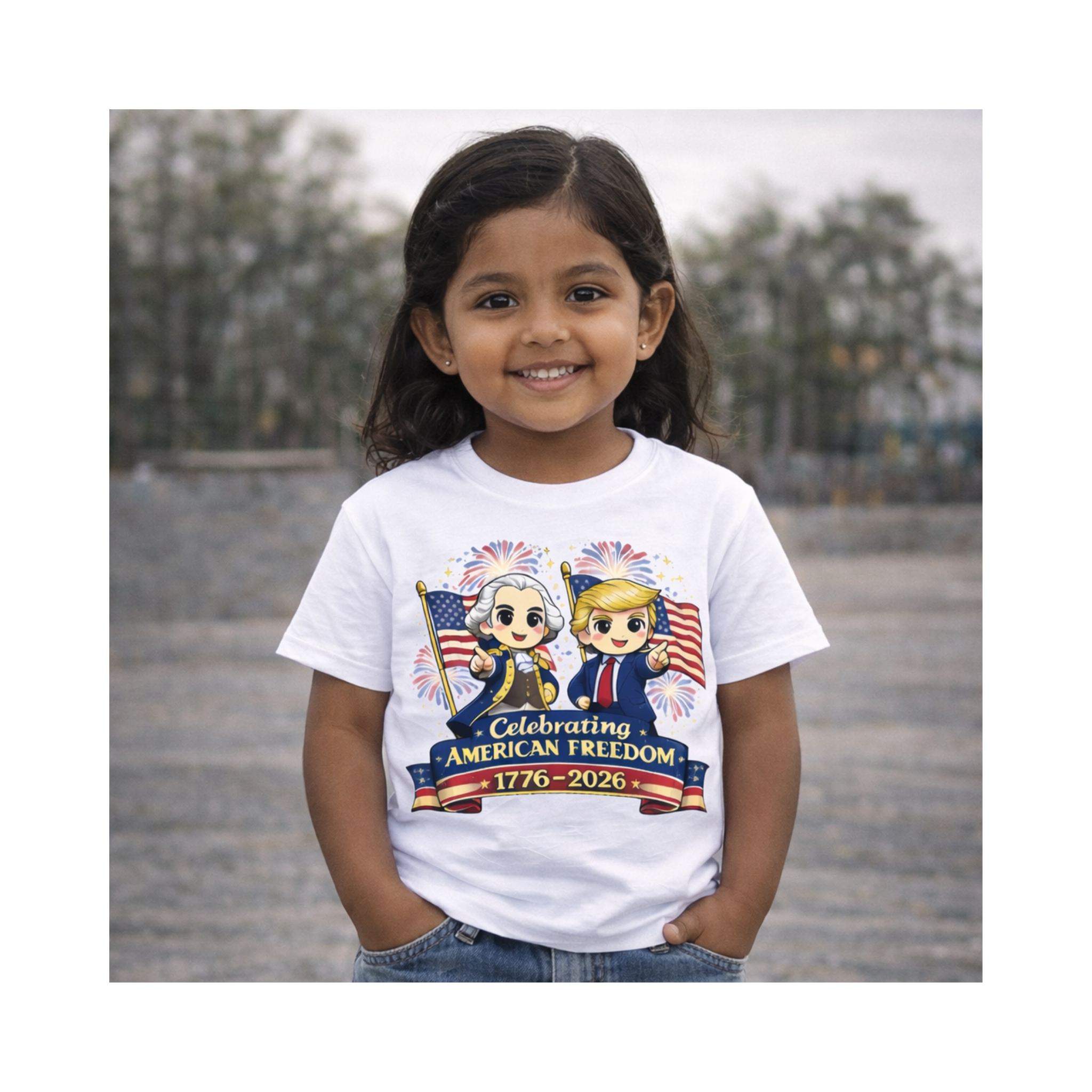 Celebrate America's 250th Anniversary with this fun and festive "Celebrating American Freedom" design.  Featuring bright patriotic elements and playful chibi-style artwork, this shirt is perfect for kids who love celebrations, holidays, and expressing American pride.