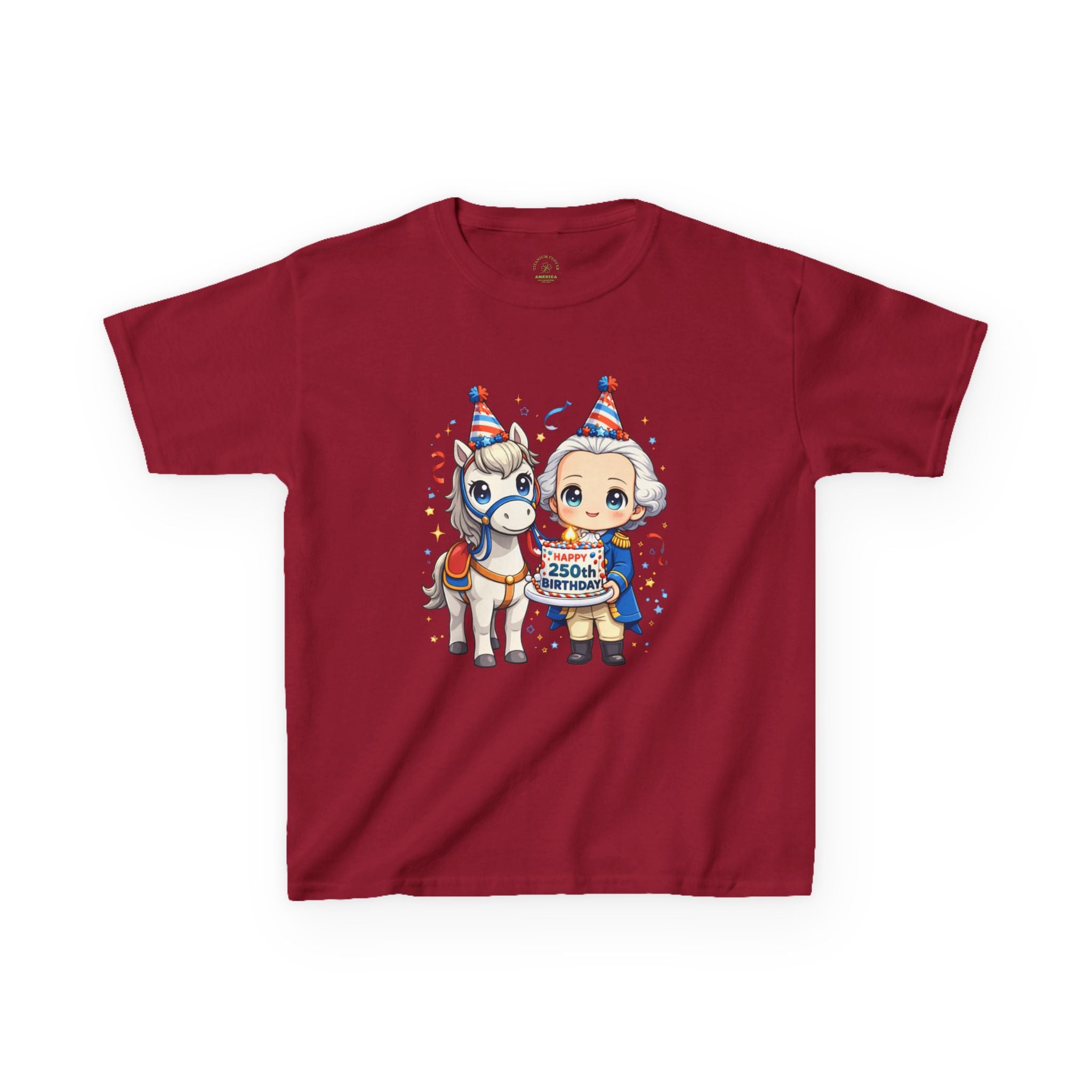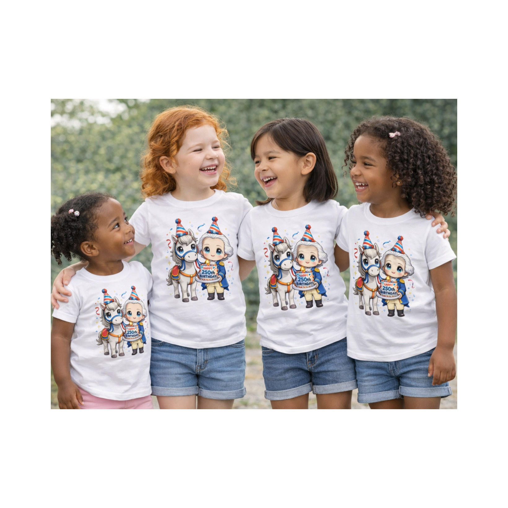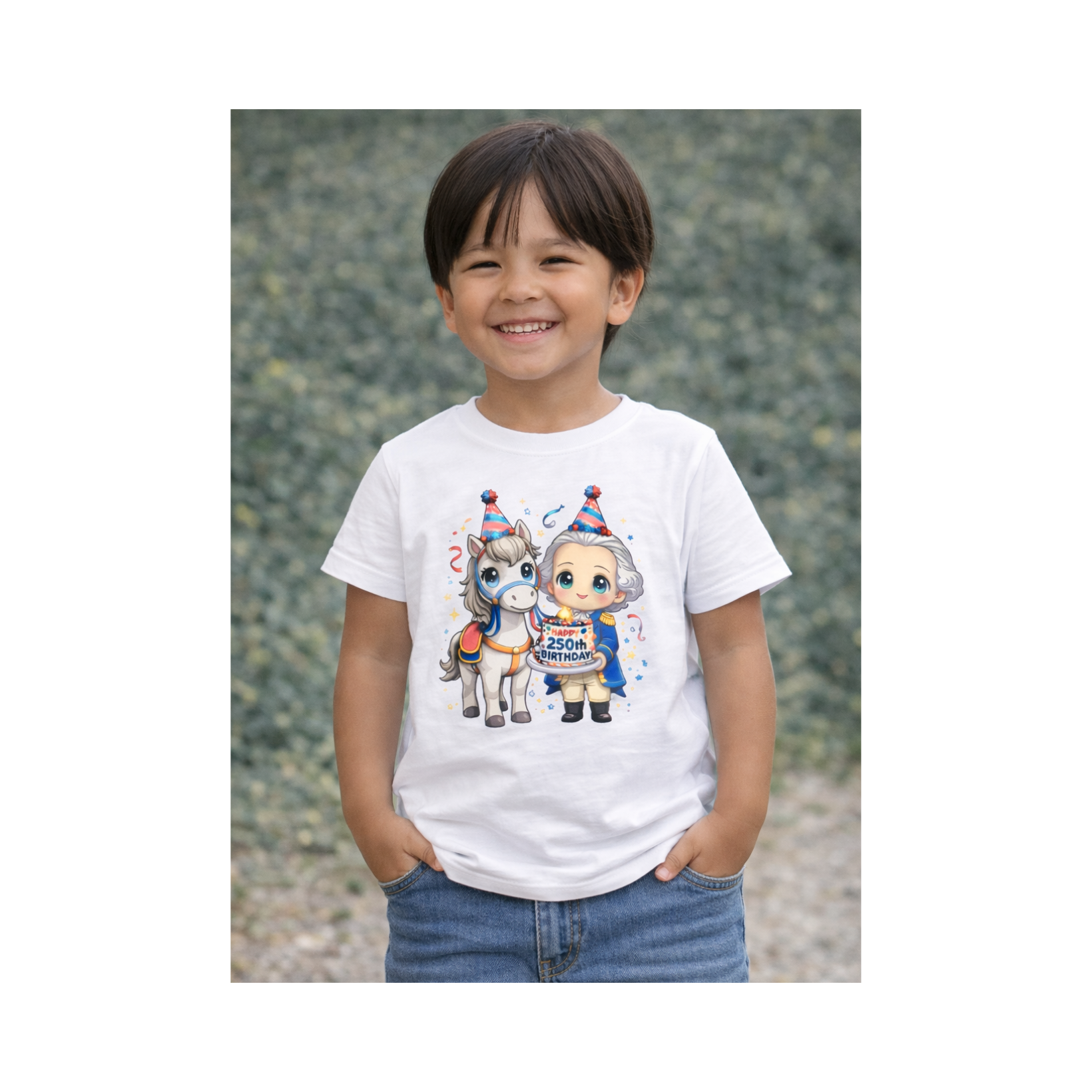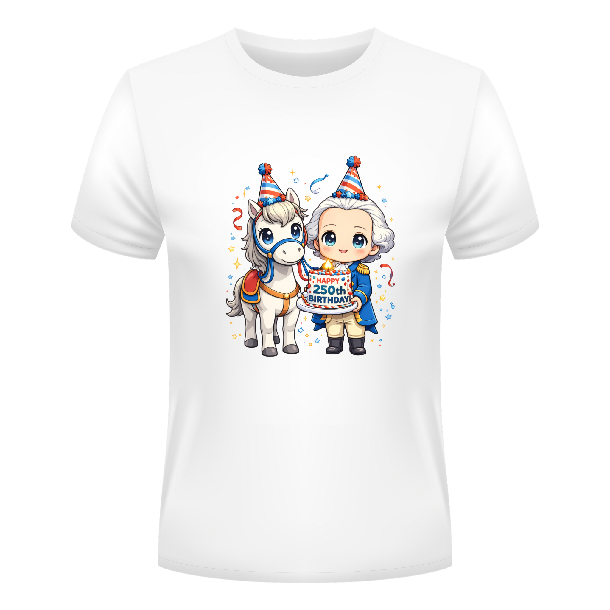 Celebrate America's 250th Birthday with this fun and adorable Chibi - style George Washington design.  Perfect for kids who love festive celebrations and patriotic themes, this shirt combines historic pride with playful charm.