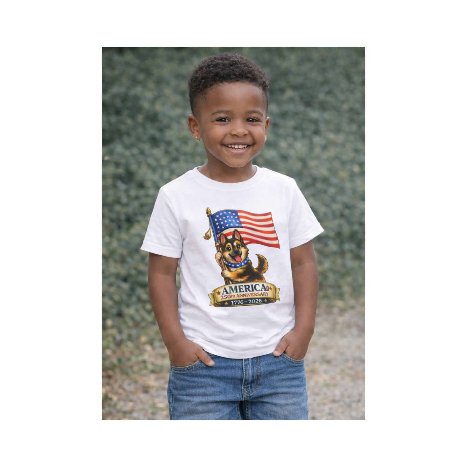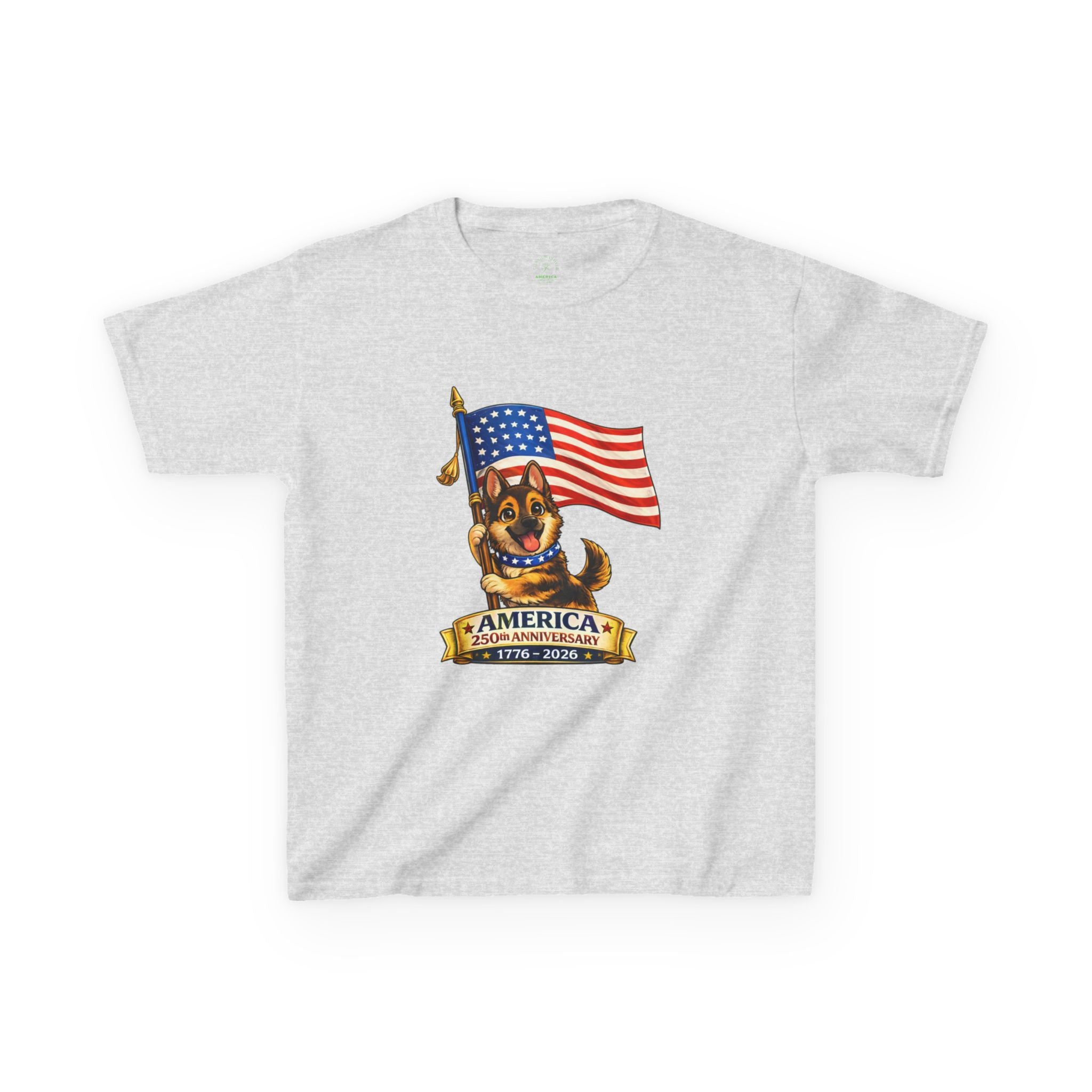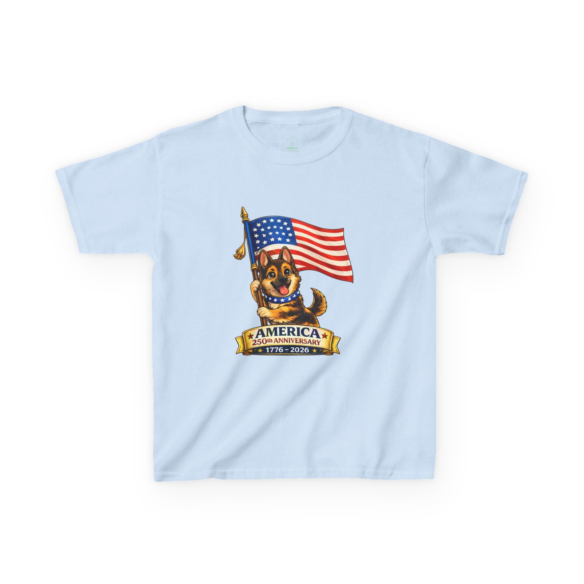 Celebrate America's 250th Anniversary with this fun and adorable patriotic puppy design.  Perfect for kids who love dogs and patriotic celebrations, this shirt blends cuteness with historic pride.