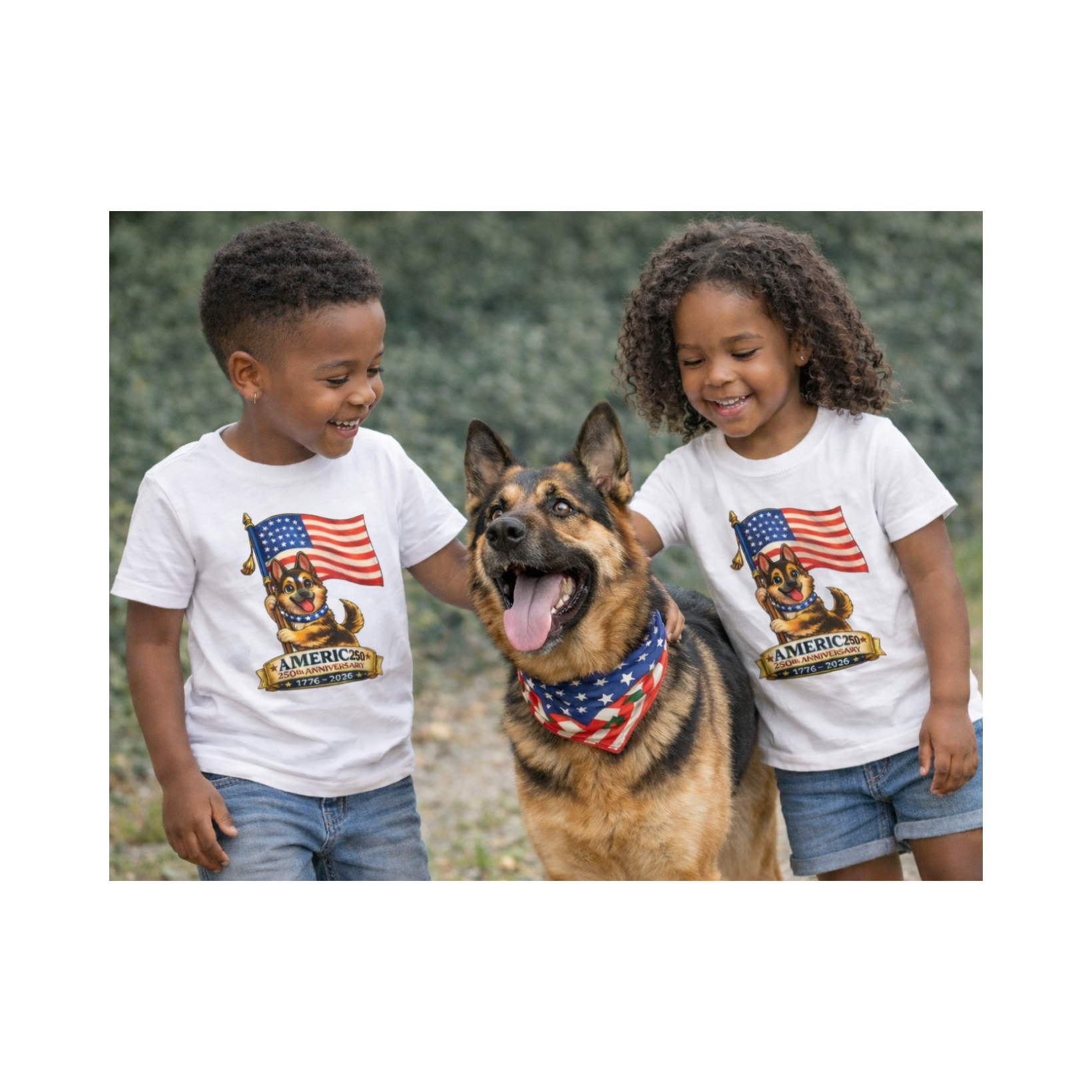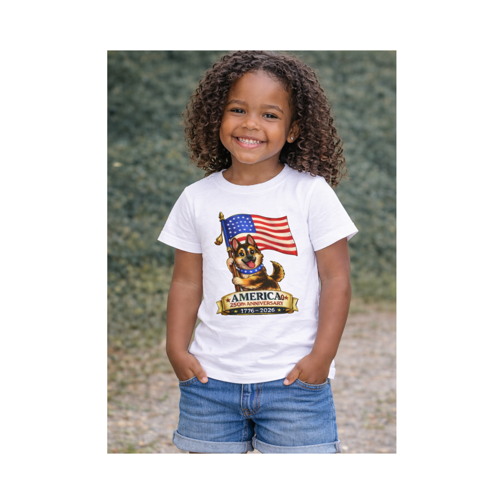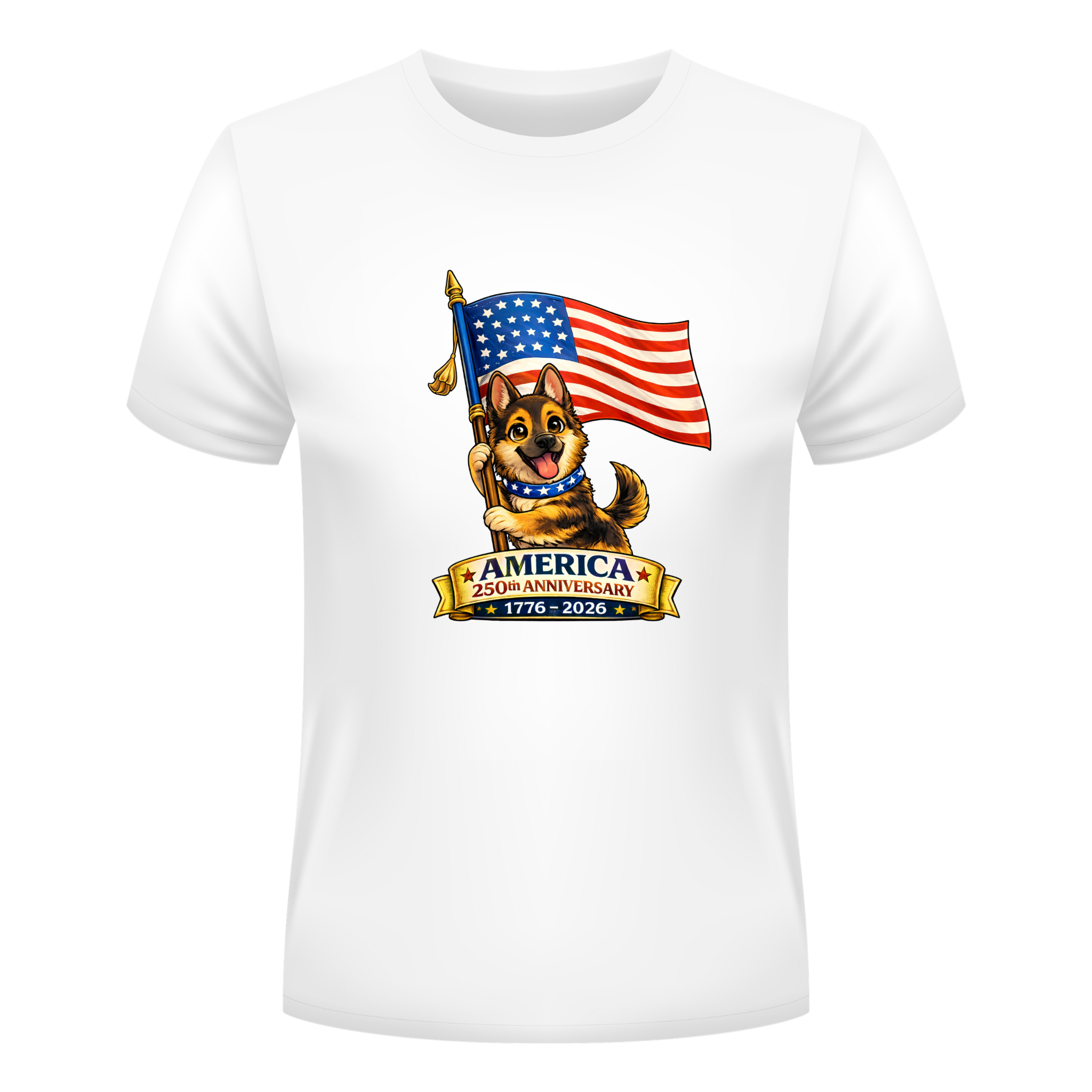 Celebrate America's 250th Anniversary with this fun and adorable patriotic puppy design.  Perfect for kids who love dogs and patriotic celebrations, this shirt blends cuteness with historic pride.